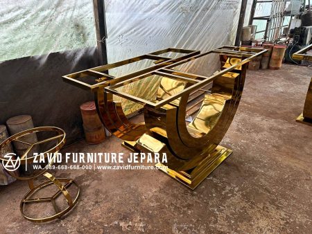 Seperti gambar diatas rangka kaki meja makan stainless ini dari bahan stainless steel yang difinishing gold cantik dengan desain silang. Rangka kaki meja ini menggunakan top table berbentuk persegi panjang. Rangka kaki ini cocoknya menggunakan daun meja berbahan dasar marmer ataupun kaca yang akan bisa menciptakan kesan aesthetic nan mewah pada ruangan anda. Desain plat silang pada rangka kaki meja stainless ini menciptakan kesan modern pada ruangan anda, juga menambah kekokohan pada meja tersebut.